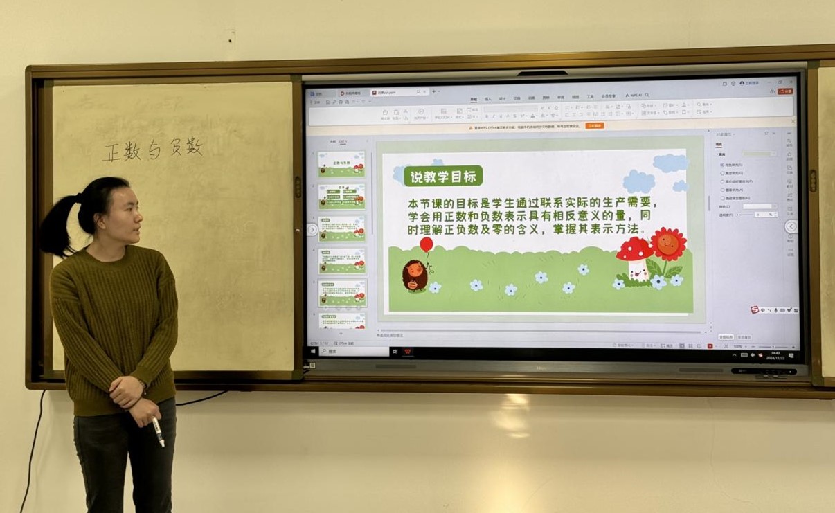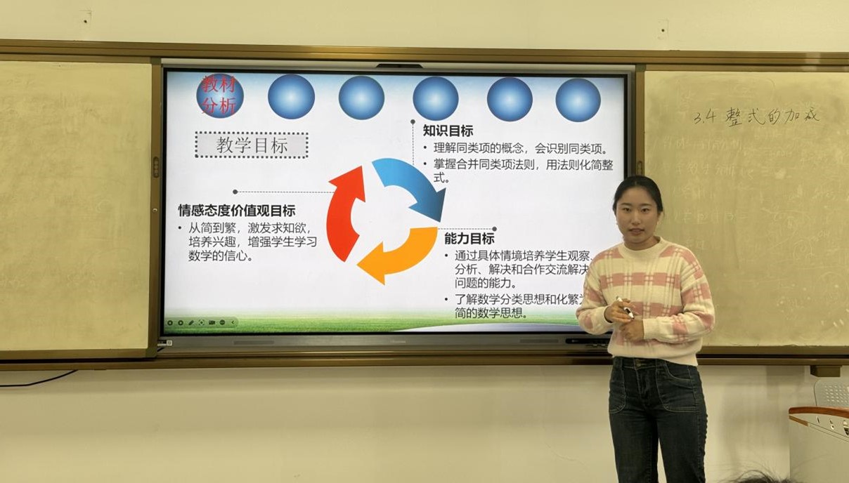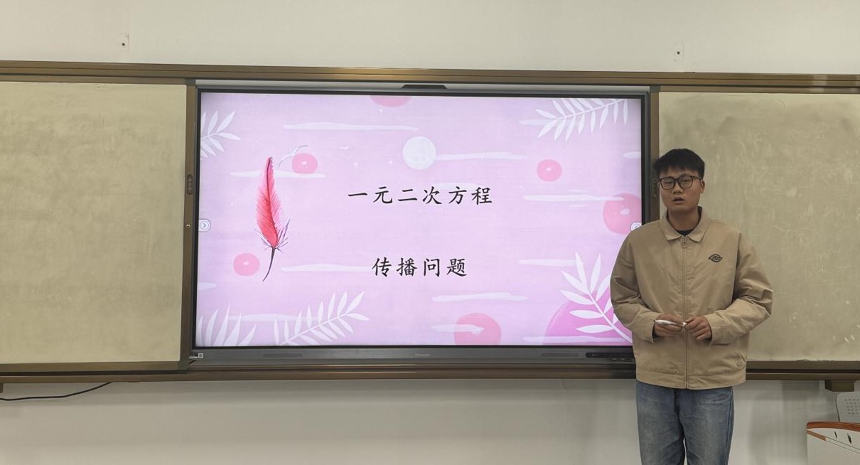 本次活动第一个环节是结合教学实际以说课的形式展示普通话与粉笔字。李岱瑶同学吐字清晰、声音洪亮地向大家介绍了合并同类项的相关知识,她自信大方、满怀激情地展示了一场精彩的说课;王思哲同学讲述的内容是一元二次方程的传播问题,他教态自然、知识点把握较为准确、肢体语言丰富。他们在讲台上流露出自信的面容,他们拿起粉笔,在黑板上尽情挥洒,一个个规范、美观的粉笔字跃然“板”上。此外,何佳丽同学在介绍正数与负数的过程中,板书工整规范,语言具有感染力且注重与学生交流互动,做到了以学生为中心。