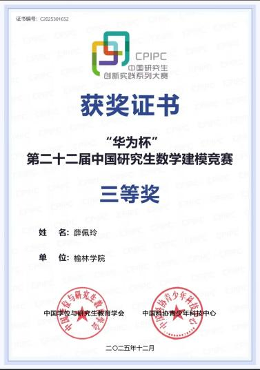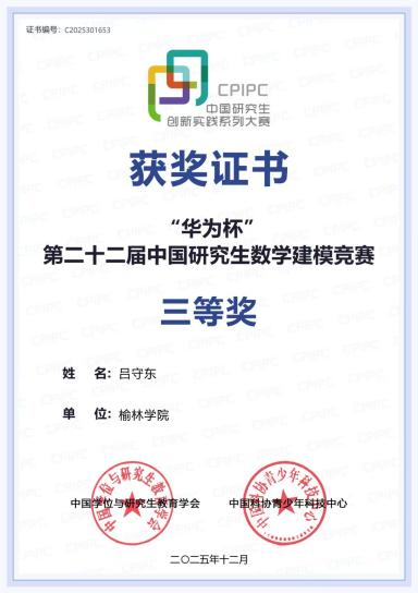 近日,由教育部学位管理与研究生教育司指导、中国学位与研究生教育学会等单位主办的“华为杯”第二十二届中国研究生数学建模竞赛成绩揭晓。我院研究生吕守东、薛佩玲团队荣获国家级三等奖,是全校唯一获此殊荣的队伍,实现我校在该项赛事中的历史性突破!