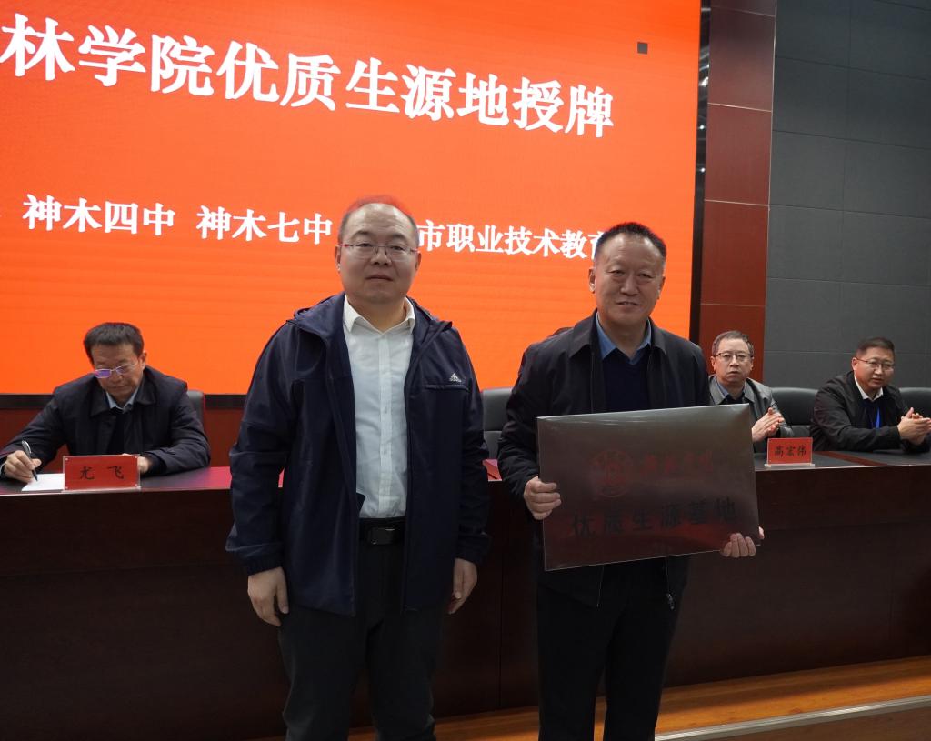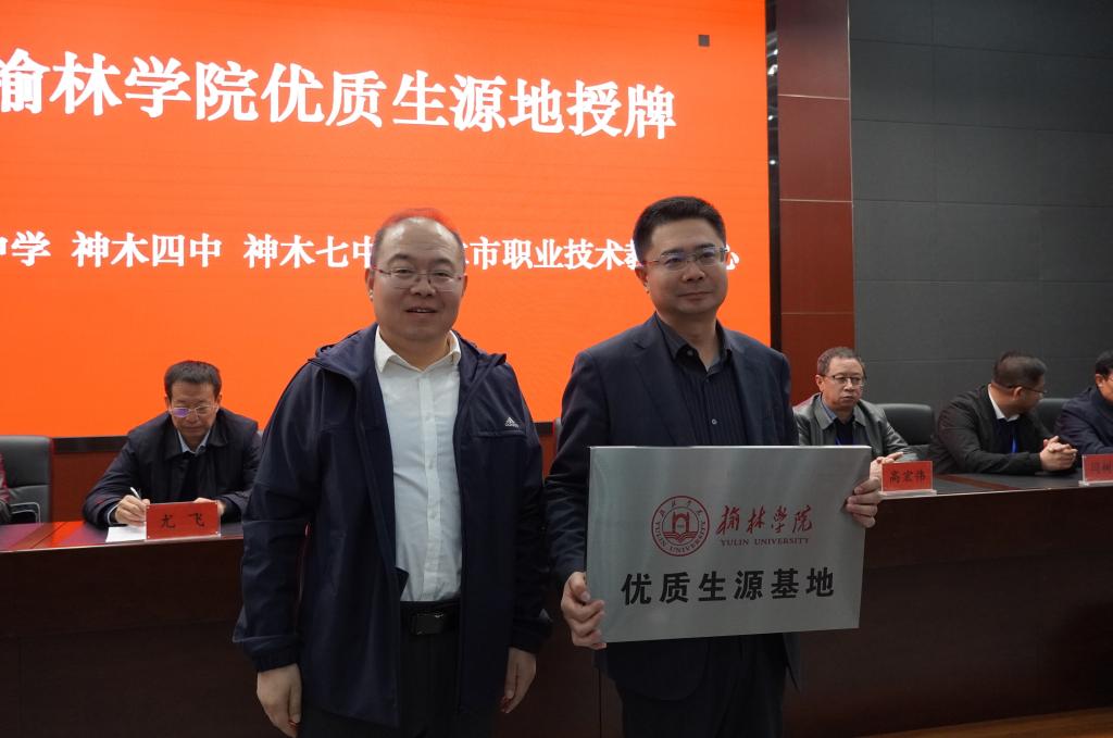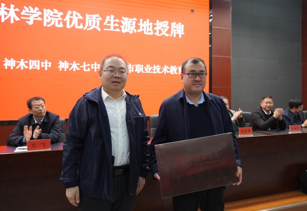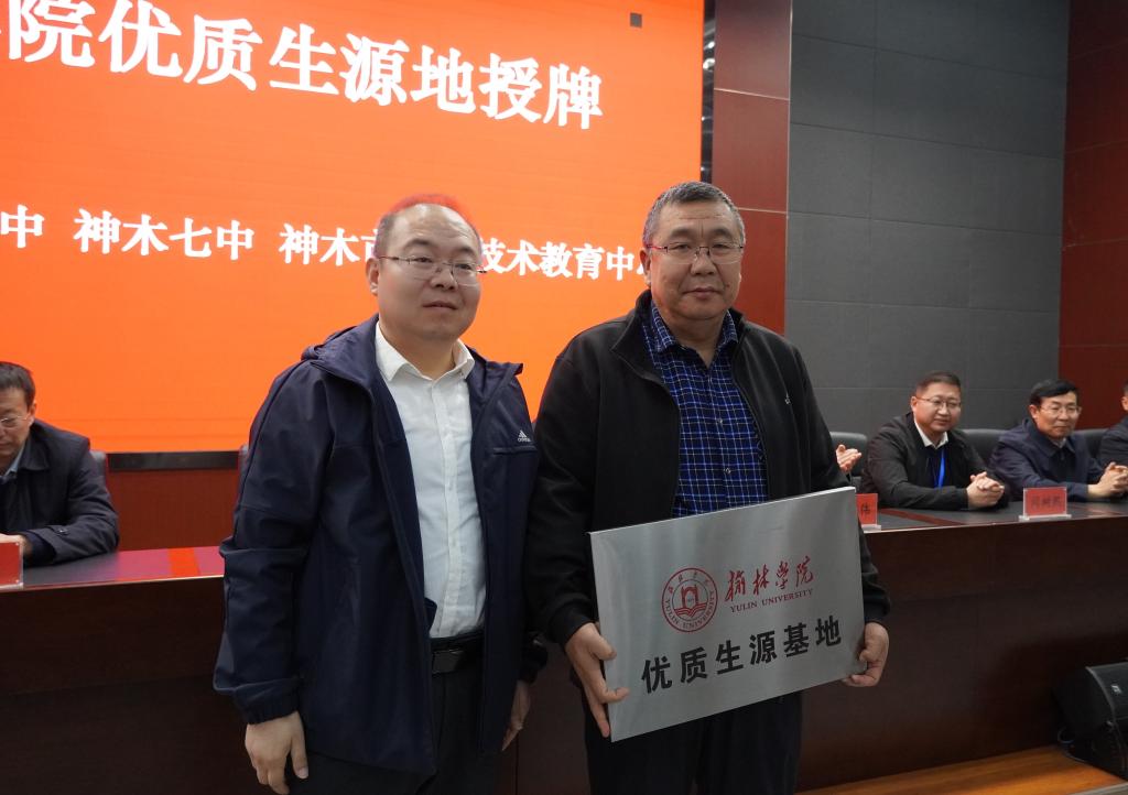 副校长闫龙代表伟德国际1946bv向神木中学、神木四中、神木七中、神木市职业技术教育中心授予“优质生源基地”牌。