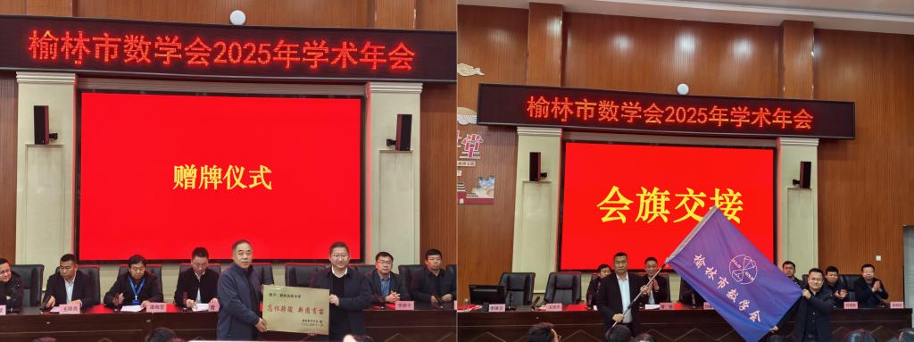 年会主题鲜明、内容丰富、组织严密、成果丰硕,是一次有高度、有深度、有温度的学术盛会,完成所有既定议程,年会顺利闭幕。榆林市数学会副理事长、榆林中学副校长常伟致闭幕词,学会理事长闫树熙教授为本届年会的承办方榆林高新中学赠牌感谢,会议确定2026年榆林市数学会学术年会由神木市第四中学承办,两所学校完成会旗交接仪式。