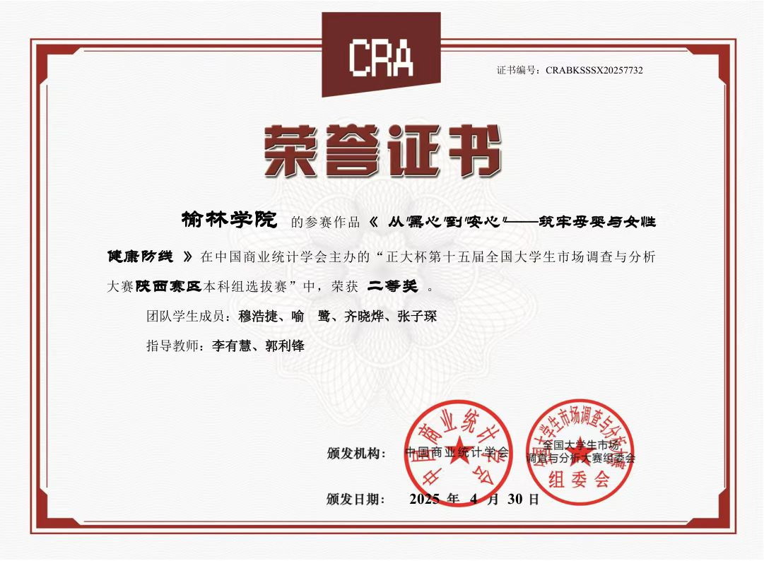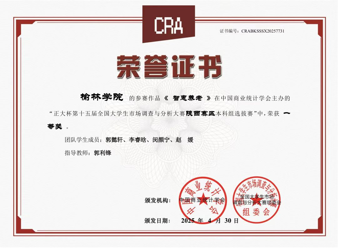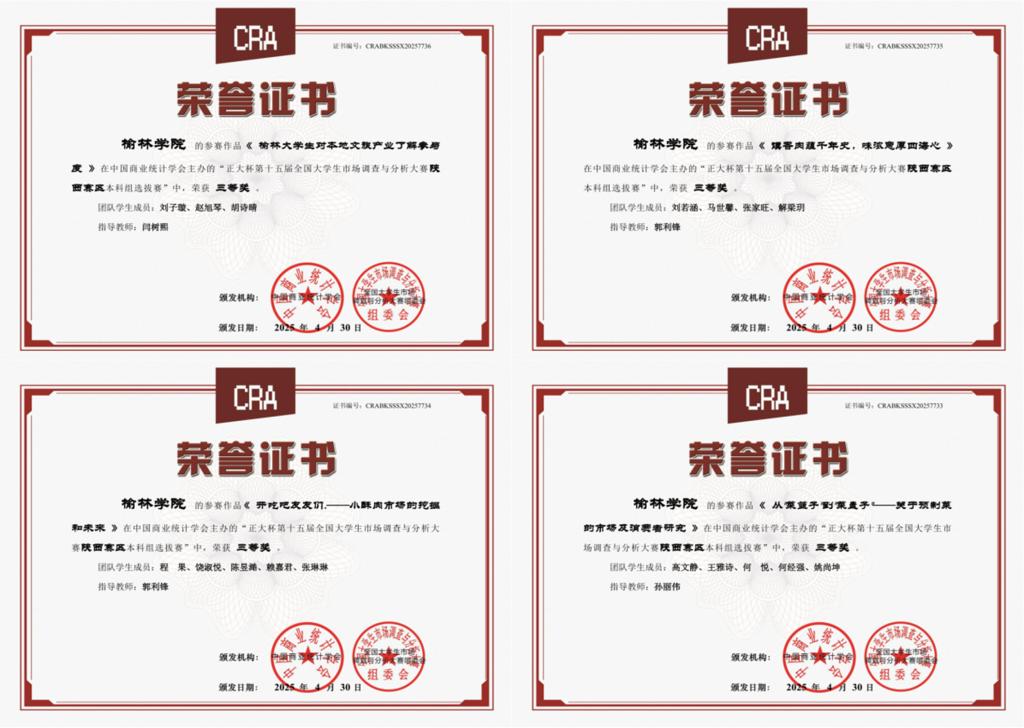 在2025年“正大杯”第十五届全国大学生市场调查与分析大赛中,我院应用统计学和金融工程专业学生表现优异,获得省级奖项7项,其中,省级一等奖2项、二等奖1项和三等奖4项,再创佳绩,体现了我院坚持“以赛促学、以赛促教和以赛促创”助推应用型人才培养的良好成效。