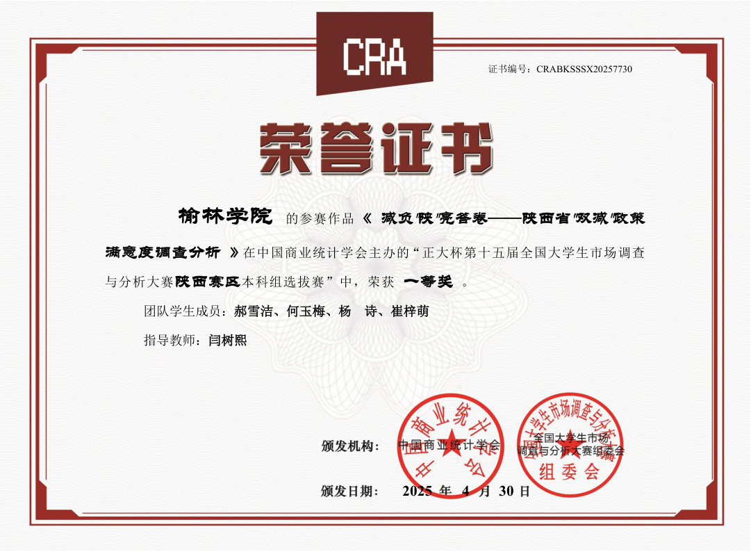 本届大赛陕西赛区吸引了全省41所高校的496支队伍参赛,1946伟德国际源自英国代表我校选拔指导参赛的7支队伍,凭借扎实的统计专业功底和出色的调研分析能力全部获奖,其中,由闫树熙老师指导的《减负“陕”亮答卷——陕西省“双减”政策满意度调查分析》和郭利锋老师指导的《智惠养老》参赛作品荣获省赛一等奖,李有慧老师指导的参赛作品荣获省赛二等奖,另外4项参赛作品,获得省赛三等奖。